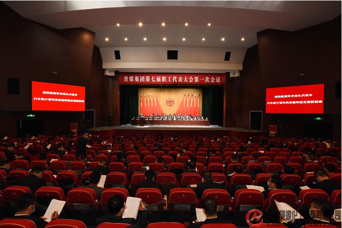 晉煤集團(tuán)七屆一次職代會(huì)會(huì)場內(nèi),主席臺(tái)后幕正中由晉煤標(biāo)志“JM”縮寫組合而成的企徽,在分列兩側(cè)的10面鮮艷紅旗映襯下熠熠生輝。二樓眺臺(tái)上懸掛著“勇?lián)茉锤锩蓬^兵使命 只爭朝夕譜寫高質(zhì)量轉(zhuǎn)型發(fā)展新篇章”的橫幅。整個(gè)會(huì)場氣氛莊嚴(yán)熱烈。