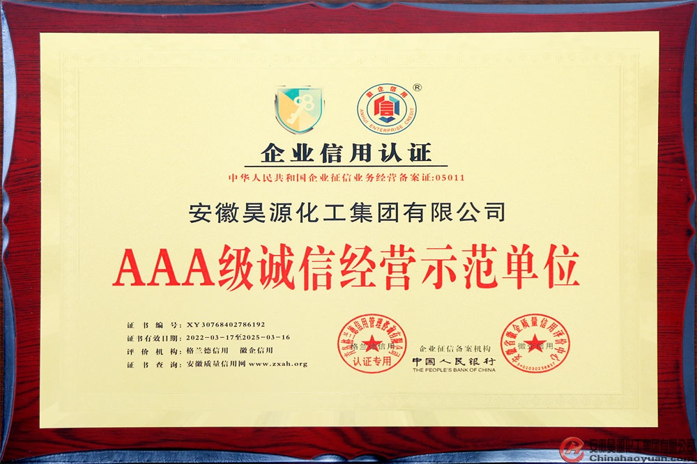 安徽省徽企質(zhì)量信用評價中心依據(jù)GB/T23791-2009《企業(yè)質(zhì)量信用等級劃分通則》,通過基本信息、政府監(jiān)管、媒體信息、企業(yè)資質(zhì)、質(zhì)量檢查、法院判決、知識產(chǎn)權(quán)、社會責(zé)任、企業(yè)運(yùn)營等信用信息,進(jìn)行客觀獨(dú)立的集成、分析和評定。針對公司的信用記錄,經(jīng)營狀況、財務(wù)指標(biāo)、發(fā)展前景,結(jié)合國家及地方相關(guān)政策,本著公平、公正、獨(dú)立、客觀、科學(xué)原則,評定安徽昊源化工集團(tuán)有限公司為AAA級誠信經(jīng)營示范單位,并為公司頒發(fā)了牌匾及證書。