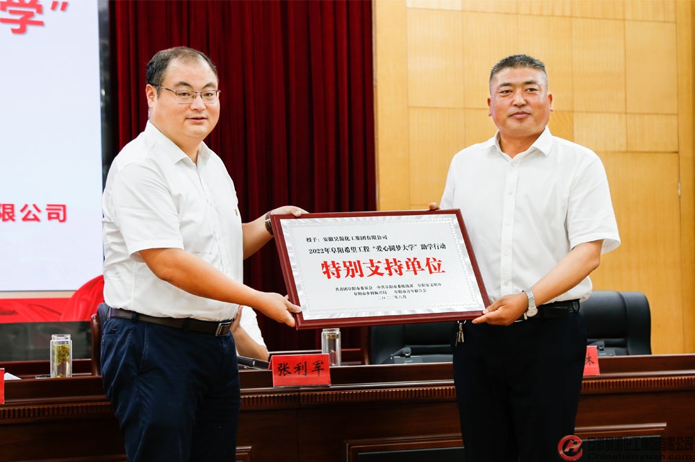隨后,團(tuán)市委書記汝磊向昊源公司頒發(fā)2022年阜陽(yáng)希望工程“愛心圓夢(mèng)大學(xué)”助學(xué)行動(dòng)特別支持單位獎(jiǎng)牌,感謝昊源公司多年來對(duì)愛心助學(xué)行動(dòng)等公益事業(yè)的大力支持。