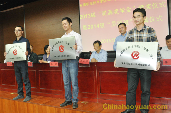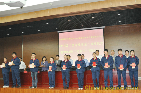 10月23日,安徽職業(yè)技術(shù)學(xué)院2013級“昊源獎學(xué)金” 頒獎儀式暨2014級“昊源班” 授牌儀式在安徽職業(yè)技術(shù)學(xué)院圖書館三樓報告廳隆重舉行。公司副總經(jīng)理楊捷、企管處處長張明、擴(kuò)建辦副主任沈獻(xiàn)、安徽職業(yè)技術(shù)學(xué)院院長亓四華、副院長史鋒、化學(xué)工程系主任方向紅等出席頒獎授牌儀式。