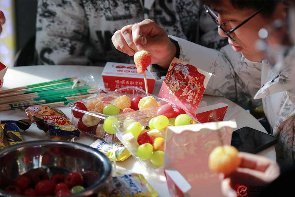 活動在一片歡聲笑語中拉開序幕。青年員工齊聚一堂,分別圍坐在5張小圓桌旁,動手和面、搟皮、包餡。不一會兒,排列整齊又形狀各異的餃子制作完成。隨后,活動現(xiàn)場還特別安排熬糖稀、制作糖葫蘆環(huán)節(jié),青年員工親手將山楂、草莓、橘子等水果串成串,再裹上晶瑩剔透的糖稀,制作出酸甜可口的糖葫蘆。