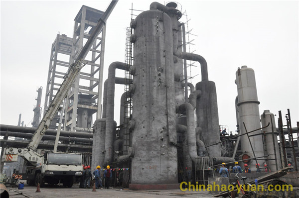 碳化車間在前一段時間生產過程中,發(fā)現飽和熱水塔到汽水冷凝器之間φ530管道出現漏點,在隨后檢測人員對該管道進行檢測過程中,發(fā)現該管道多處因腐蝕減薄出現孔洞的現象,并把這一情況及時匯報給公司高層.公司領導在得知這一情況后高度重視,并立即決定4月2日對1#變換進行停車消除這一生產隱患,并通知化機公司全力做好這一檢修工作.本次檢修屬于臨時性緊急任務,檢修內容主要為:更換飽和熱水塔到汽水冷凝器之間的長度約8.6米的φ530管道及變脫前冷卻器漏點處理、變脫塔分布器的更換.