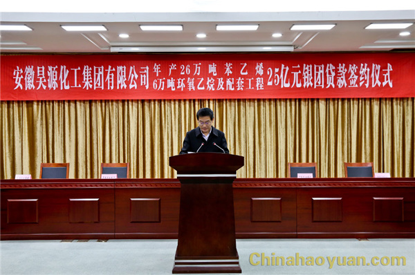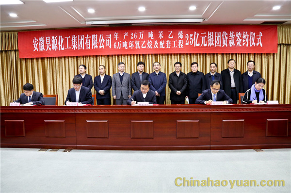 2017年1月6日上午,安徽昊源化工集團(tuán)有限公司年產(chǎn)26萬(wàn)噸苯乙烯、6萬(wàn)噸環(huán)氧乙烷及配套工程項(xiàng)目25億元銀團(tuán)貸款簽約儀式在阜陽(yáng)市政府三樓會(huì)議室舉行。市委副書(shū)記,市政府代市長(zhǎng)、黨組書(shū)記孫正東,市政府秘書(shū)長(zhǎng)王顯義、副秘書(shū)長(zhǎng)趙志賀、朱新,昊源公司黨委書(shū)記、董事長(zhǎng)凡殿才,中國(guó)建設(shè)銀行安徽省分行、中國(guó)進(jìn)出口銀行安徽省分行、中國(guó)光大銀行合肥分行、合肥科技農(nóng)村商業(yè)銀行主要負(fù)責(zé)人出席簽約儀式。
