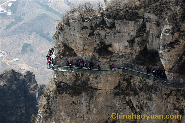 云臺山紅石峽谷長約350米,東西對峙,紅色的石層與綠寶石色的泉水相互輝映,創(chuàng)作出一幅幅美麗的圖畫!大家在感嘆著大自然神奇的同時,也挑戰(zhàn)了最具刺激驚險的玻璃棧道,大家手牽著手、肩并著肩小心翼翼地登上玻璃棧道,欣賞雄偉壯觀的奇峰俊嶺,方知“會當凌絕頂,一覽眾山小”,心情激動無比!