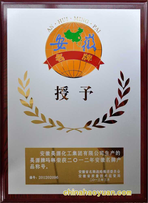 為大力宣傳安徽名牌,引導(dǎo)企業(yè)樹立名牌意識(shí),進(jìn)一步推進(jìn)全省名牌發(fā)展戰(zhàn)略的實(shí)施,省質(zhì)量技術(shù)監(jiān)督局將對(duì)獲得2012年安徽名牌稱號(hào)和通過名牌復(fù)審的企業(yè)予以表彰,公司“昊源牌嗎啉”位于2012年復(fù)審?fù)ㄟ^的安徽名牌企業(yè)名單之列。
