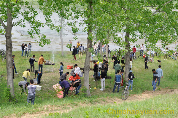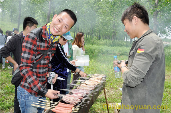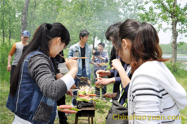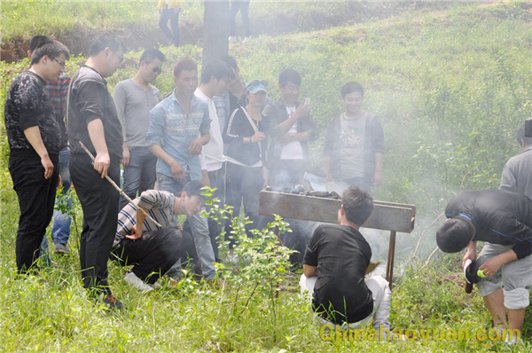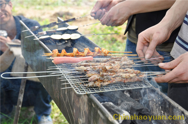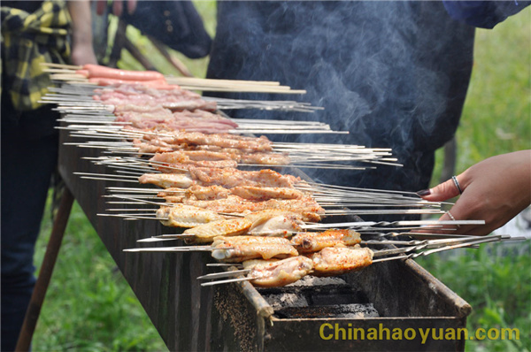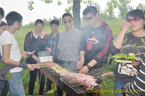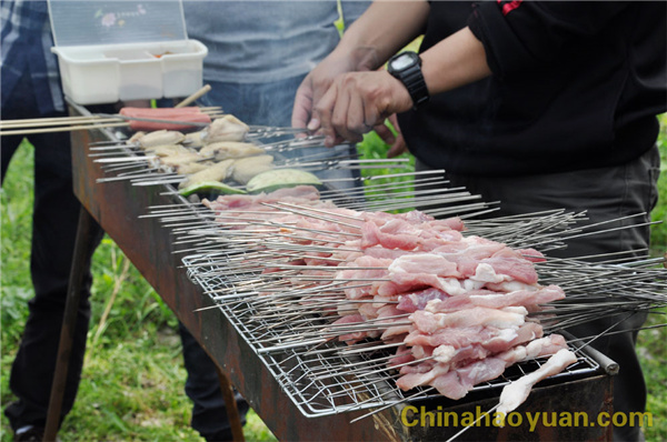 稍作休息,大家便開始了此次燒烤活動的準(zhǔn)備工作,拾柴火、生爐子、串肉串,一片熱火朝天的忙碌景象。