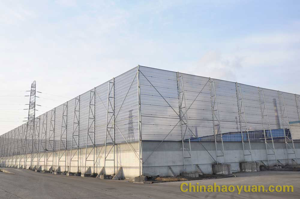 在煤場(chǎng)、渣場(chǎng)地、東廠界(共7處)周圍建設(shè)防風(fēng)抑塵網(wǎng):總長(zhǎng)度2600米,高10米,總面積約21000平方米,總投資268萬元。該工程于2014年3月開工建設(shè),2015年2月建成投用。防風(fēng)抑塵網(wǎng)擋風(fēng)板采用新型三峰防風(fēng)抑塵網(wǎng)板,其原理是是利用空氣動(dòng)力學(xué)原理,按照現(xiàn)場(chǎng)環(huán)境加工成一定幾何形的擋風(fēng)板,并根據(jù)現(xiàn)場(chǎng)條件將擋風(fēng)板組合成擋風(fēng)抑塵墻,使流通的空氣(強(qiáng)風(fēng)) 從外通過墻體時(shí),在墻體內(nèi)測(cè)形成上、下干擾的氣流,已達(dá)到外側(cè)強(qiáng)風(fēng),內(nèi)側(cè)弱風(fēng),外側(cè)小風(fēng),內(nèi)側(cè)無風(fēng)的效果,從而防止粉塵的飛揚(yáng),達(dá)到抑塵的效果。新設(shè)置的擋風(fēng)抑塵墻可有效降低來流風(fēng)的風(fēng)速,改變一部分來流風(fēng)通過擋風(fēng)抑塵墻后的風(fēng)向,最大限度地?fù)p失來流風(fēng)的動(dòng)能,避免來流風(fēng)的明顯渦流,減少風(fēng)的湍流度而達(dá)到減少起塵的目的。綜合抑塵率>85%,完全滿足環(huán)保要求。