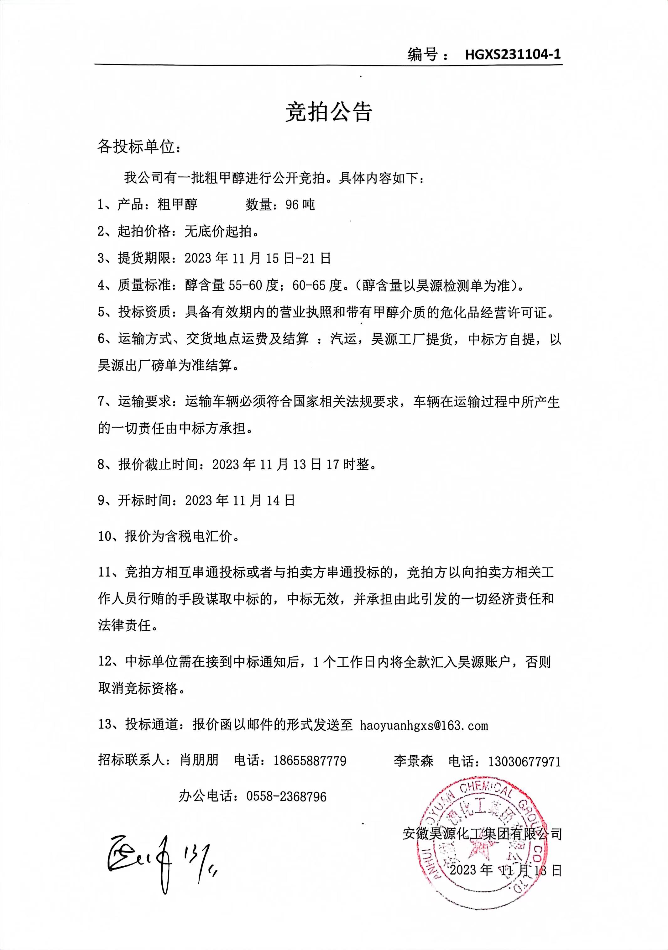 上一條:化工銷售公司乙醇競拍公告下一條:化工銷售公司甲苯產(chǎn)品招標(biāo)公告